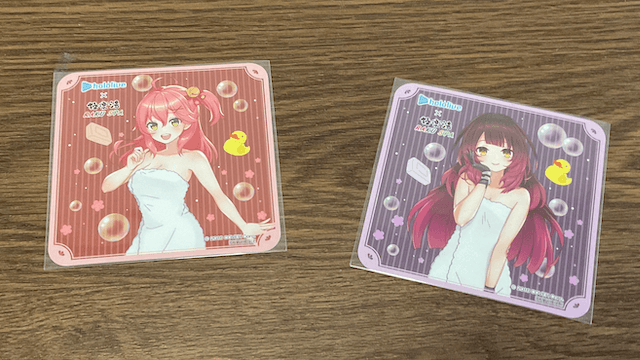 コースターは、バスタオル姿のみこちとロボ子さん。かわいいね。下半身がないのが残念だが正方形サイズなので仕方ない。